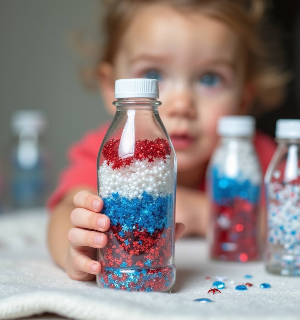 - Fill a water bottle with red, white, and blue glitter and confetti