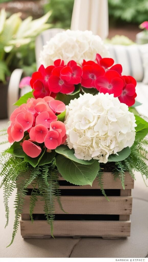 White hydrangeas add a touch of elegance, while red begonias bring a tropical flair. Combine white hydrangeas with red begonias in a rustic wooden crate or basket. Add greenery like hosta leaves or ferns to enhance the lush feel. Place the arrangement on your patio or in your garden for a garden chic vibe. Hydrangeas require consistent moisture, so water them regularly.